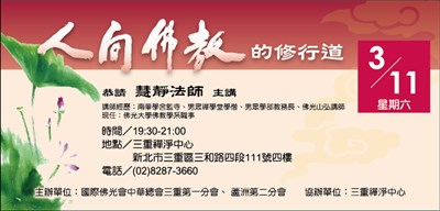 人間佛教的修行道 |2017.03.09 語音朗讀 1557觀看次 字級 大 中 小 慧靜法師佛學講座:人間佛教的修行道 時間:3月11日19:30~21:00 地點:三重禪淨中心 前一篇文章 妙檀香洗衣粉、洗衣精 下一篇文章 護國祈安祈福法會 熱門新聞 01【分數之外】看見另一種英文2026.04.0802男子氣概照護員 日本長照新力量2026.04.0503【轉移注意力】往理想中的自己邁進2026.04.0504一紙學歷換錢景 美學位價值遭質疑2026.04.0505降雨兩樣情 南部水庫沒解渴2026.04.0606【深頁凝視】《後院的鳥》凝神注視鳥兒登場2026.04.0507MLB鄧愷威拆彈 守住今井旅美首勝2026.04.0608租賃車業者違法攬客 觀光署:最高罰200萬元2026.04.0709暴雨狂炸苗栗 災情頻傳 2026.04.0510杉林溪園區 紫藤花盛開2026.04.08 訂閱電子報 台北市 天氣預報 台灣一週天氣預報 相關報導 以文字護持人間福報運動睡眠新科技 養生保健新利器房仲第一品牌 永慶加薪3% 體驗美好手作 製皂幸福時光 博愛社大春季班招生中 薩克斯風吹奏春季班 人間大學台中分校招生中 跨越十年縱橫南半球到北半球 《行者》新書上市