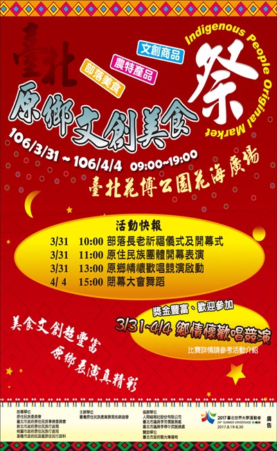 原民會展 |2017.03.09 語音朗讀 1447觀看次 字級 大 中 小 原鄕文創美食祭 3/31-4/4上午9時至晚上7時,台北花博公園花海廣場展出。 前一篇文章 護國祈安祈福法會 下一篇文章 福報購商品:綠寶®綠藻片 熱門新聞 01【分數之外】看見另一種英文2026.04.0802男子氣概照護員 日本長照新力量2026.04.0503【轉移注意力】往理想中的自己邁進2026.04.0504一紙學歷換錢景 美學位價值遭質疑2026.04.0505降雨兩樣情 南部水庫沒解渴2026.04.0606【深頁凝視】《後院的鳥》凝神注視鳥兒登場2026.04.0507MLB鄧愷威拆彈 守住今井旅美首勝2026.04.0608租賃車業者違法攬客 觀光署:最高罰200萬元2026.04.0709暴雨狂炸苗栗 災情頻傳 2026.04.0510杉林溪園區 紫藤花盛開2026.04.08 訂閱電子報 台北市 天氣預報 台灣一週天氣預報 相關報導 以文字護持人間福報運動睡眠新科技 養生保健新利器房仲第一品牌 永慶加薪3% 體驗美好手作 製皂幸福時光 博愛社大春季班招生中 薩克斯風吹奏春季班 人間大學台中分校招生中 跨越十年縱橫南半球到北半球 《行者》新書上市