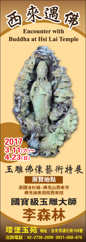 悉來遇佛─玉雕佛像藝術特展 |2017.03.09 語音朗讀 779觀看次 字級 大 中 小 悉來遇佛─玉雕佛像藝術特展 展出時間:3/11~4/23 展出地點:美國洛杉磯-佛光山西來寺佛光緣美術館西來館 前一篇文章 司改會議 擬增「裡應外合」法制 下一篇文章 蔡英文 接掌文化總會 熱門新聞 01【獻給動物朋友的詩】站成蘭花的螳螂與嘗到幸福滋味的蜂2026.01.2902【傳燈六十‧百年仰望】星雲大師一筆字書法紀念特展概述2026.01.3003澳網 辛納拚3連霸 小蠻牛盼全滿貫2026.01.3004曼谷文教中心 傳遞佛陀慈悲2026.01.2905【詩】我的母親不是個詩人2026.01.2906芝加哥禪淨中心 臘八粥饗眾2026.01.2907土方之亂推高成本 房價漲壓浮現2026.02.0208【紀實攝影】花蓮月光寺 台灣後山的人間淨土2026.02.0109AI加速自動化 亞馬遜全球裁員 3 萬人 2026.01.2910佛光山大雄寶殿 逾千僧信迎萬佛2026.02.01 訂閱電子報 台北市 天氣預報 台灣一週天氣預報 相關報導 蕭:兩岸合作賺世界錢國共論壇登場 藍:兩岸露暖意競選總部成立 黃國昌:3階段推藍白合黃仁勳兆元宴 供應鏈高層到場海鯤艦2度潛航測試 軍事迷喊加油魯比歐:習視統一為歷史使命