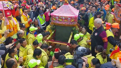 白沙屯媽祖今天上午8時抵達秋茂園進行換轎儀式,從進香輕便神轎換乘八抬大轎。圖/胡蓬生