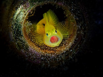 一年一度索尼世界攝影大賽3日公布公開賽野生動物類別入圍照片,分別出自美國、新加坡、義大利等多國攝影師之手,其中有一張鰕虎魚在瓶口張嘴的照片,是由台灣水下攝影師吳秀玲所拍攝,也是唯一的台灣入圍者。