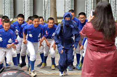 日本超馬跑者井上真悟穿忍者裝(後右2),和卑南國中15名棒球隊員,從台東縣政府跑到卑南國中。圖/中央社