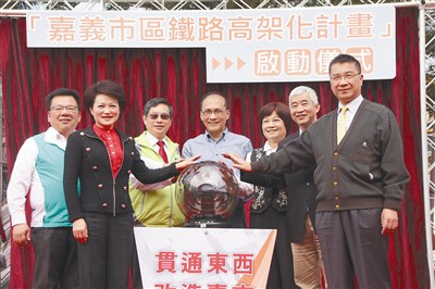 嘉義市區鐵路高架化計畫,昨由行政院長林全(中)、交通部長賀陳旦(右二)、嘉義市長涂醒哲(左三)等人主持啟動儀式,預計斥資兩百七十五億元,一一五年完工。圖/中央社