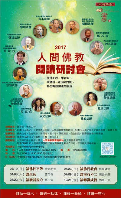 人間佛教閱讀研討會 |2017.03.11 語音朗讀 343觀看次 字級 大 中 小 人間佛教閱讀研討會 日期/地點:3/19金光明寺、4/8普門寺、4/22惠中寺、4/23屏東講堂、7/9南台別院、10/21佛光山寺 時間:早上9:30至15:30 前一篇文章 「日本佐藤園」佐藤園抹茶粉 下一篇文章 佛光山均頭國民中小學招生 熱門新聞 01【分數之外】看見另一種英文2026.04.0802男子氣概照護員 日本長照新力量2026.04.0503【轉移注意力】往理想中的自己邁進2026.04.0504降雨兩樣情 南部水庫沒解渴2026.04.0605美課藥品重稅 台灣沒優惠 2026.04.0406一紙學歷換錢景 美學位價值遭質疑2026.04.0507租賃車業者違法攬客 觀光署:最高罰200萬元2026.04.0708【深頁凝視】《後院的鳥》凝神注視鳥兒登場2026.04.0509MLB鄧愷威拆彈 守住今井旅美首勝2026.04.0610暴雨狂炸苗栗 災情頻傳 2026.04.05 訂閱電子報 台北市 天氣預報 台灣一週天氣預報 相關報導 以文字護持人間福報運動睡眠新科技 養生保健新利器房仲第一品牌 永慶加薪3% 體驗美好手作 製皂幸福時光 博愛社大春季班招生中 薩克斯風吹奏春季班 人間大學台中分校招生中 跨越十年縱橫南半球到北半球 《行者》新書上市