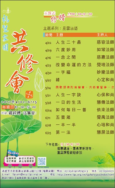 福慧家園共修會 |2017.03.16 語音朗讀 528觀看次 字級 大 中 小 福慧家園共修會 4/2~6/25每周日10時至15時於藏經樓-法寶舉行 前一篇文章 從八正道談人間佛教的實踐(二) 下一篇文章 「龍的傳人」 書法雄渾蒼勁 熱門新聞 01【讓愛自由】纏繞與獨立之間2026.04.0202新生首次到校2026.04.0203星雲大師靈骨分燈泰國 化益世人2026.04.0204打字機重返課堂 對抗AI代寫2026.04.0205租賃車業者違法攬客 觀光署:最高罰200萬元2026.04.0706緬甸佛學院訪佛光山 深化教育弘法發展2026.04.0207日月潭蓄水率 跌破6成2026.04.0208睡足多運動常吃蔬菜 改善生活習慣促健康2026.04.0209徐若熙日職初登板 6局6K奪首勝2026.04.0210奧斯陸佛光童軍 體驗禪修學滑雪2026.04.02 訂閱電子報 台北市 天氣預報 台灣一週天氣預報 相關報導 以文字護持人間福報運動睡眠新科技 養生保健新利器房仲第一品牌 永慶加薪3% 體驗美好手作 製皂幸福時光 博愛社大春季班招生中 薩克斯風吹奏春季班 人間大學台中分校招生中 跨越十年縱橫南半球到北半球 《行者》新書上市