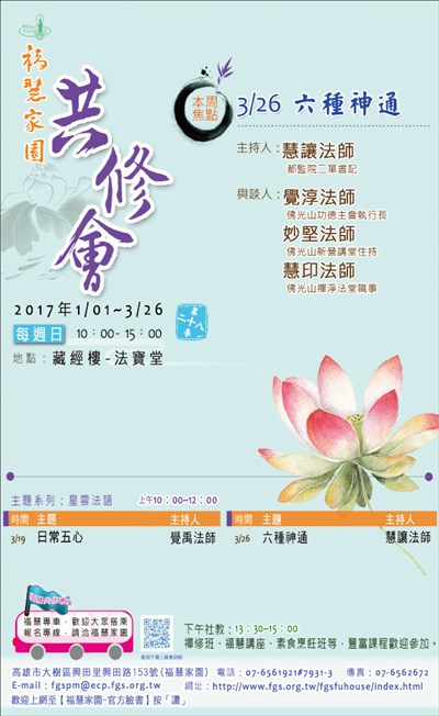 福慧家園共修會 |2017.03.20 語音朗讀 516觀看次 字級 大 中 小 福慧家園共修會 慧讓法師主持,與談人:覺淳、妙堅、慧印法師。 地點:佛光山藏經樓-法寶堂 時間:上午10:00~12:00 前一篇文章 Nissako 留藝手精密陶瓷刀 下一篇文章 勝鬘書院招生 熱門新聞 01明德水庫蓄水量僅27% 今起供4停42026.04.0102【讓愛自由】纏繞與獨立之間2026.04.0203新生首次到校2026.04.0204星雲大師靈骨分燈日本 法燈長明2026.04.0105星雲大師靈骨分燈泰國 化益世人2026.04.02069公尺高恐龍 現身澄清湖2026.04.0107東京櫻花滿開2026.04.0108打字機重返課堂 對抗AI代寫2026.04.0209中美並重 鄭麗文傳6月訪美2026.04.0110睽違53年 NASA載人繞月1日升空2026.04.01 訂閱電子報 台北市 天氣預報 台灣一週天氣預報 相關報導 以文字護持人間福報運動睡眠新科技 養生保健新利器房仲第一品牌 永慶加薪3% 體驗美好手作 製皂幸福時光 博愛社大春季班招生中 薩克斯風吹奏春季班 人間大學台中分校招生中 跨越十年縱橫南半球到北半球 《行者》新書上市