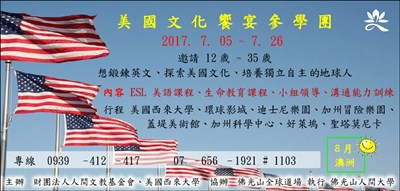 美國文化饗宴參學團 歡迎報名 |2017.03.22 語音朗讀 412觀看次 字級 大 中 小 美國文化饗宴參學團 歡迎報名 邀請12歲~35歲想鍛鍊英文、探索美國文化、培養獨立自主的地球人參加。 前一篇文章 關懷專刊 懷抱希望 下一篇文章 佛光山短期出家修道會 熱門新聞 01最大規模無王日 逾3200場反川示威2026.03.3002美首批陸戰隊抵中東 地面戰在即2026.03.3003宜蘭綠博會 探索真理2026.03.3004陸首都維安 北京全面管制無人機2026.03.3005MLB 鄧愷威轉隊太空人 初登板奪首勝2026.03.3006乾旱嚴峻 雲林古坑春茶產量腰斬2026.03.3007北韓強化戰略武器2026.03.3008拉斐爾壁畫2026.03.3009昆士蘭協會 榮獲洛根市文化影響力獎2026.03.3010剛果文化壁畫2026.03.30 訂閱電子報 台北市 天氣預報 台灣一週天氣預報 相關報導 以文字護持人間福報運動睡眠新科技 養生保健新利器房仲第一品牌 永慶加薪3% 體驗美好手作 製皂幸福時光 博愛社大春季班招生中 薩克斯風吹奏春季班 人間大學台中分校招生中 跨越十年縱橫南半球到北半球 《行者》新書上市