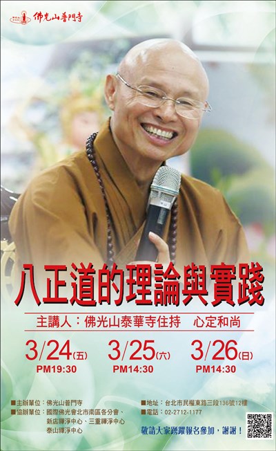 講座:八正道的理論與實踐 |2017.03.22 語音朗讀 705觀看次 字級 大 中 小 心定和尚講座:八正道的理論與實踐 時間:3/24晚上7點30分、3/25~26下午2點30分 地點:佛光山普門寺 前一篇文章 妙檀香洗衣粉、洗衣精 下一篇文章 福慧家園共修會總表 熱門新聞 01最大規模無王日 逾3200場反川示威2026.03.3002宜蘭綠博會 探索真理2026.03.3003陸首都維安 北京全面管制無人機2026.03.3004MLB 鄧愷威轉隊太空人 初登板奪首勝2026.03.3005美首批陸戰隊抵中東 地面戰在即2026.03.3006乾旱嚴峻 雲林古坑春茶產量腰斬2026.03.3007北韓強化戰略武器2026.03.3008拉斐爾壁畫2026.03.3009剛果文化壁畫2026.03.3010昆士蘭協會 榮獲洛根市文化影響力獎2026.03.30 訂閱電子報 台北市 天氣預報 台灣一週天氣預報 相關報導 以文字護持人間福報運動睡眠新科技 養生保健新利器房仲第一品牌 永慶加薪3% 體驗美好手作 製皂幸福時光 博愛社大春季班招生中 薩克斯風吹奏春季班 人間大學台中分校招生中 跨越十年縱橫南半球到北半球 《行者》新書上市