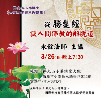 從勝鬘經談人間佛教的解脫道 |2017.03.24 語音朗讀 392觀看次 字級 大 中 小 從勝鬘經談人間佛教的解脫道,永餘法師主講。 時間:3/26晚上7時30分 地點:佛光山小港講堂大殿 前一篇文章 勝鬘書院招生 下一篇文章 關懷贈報 熱門新聞 01推動科學辦案 鑑識權威李昌鈺87歲辭世2026.03.2902佛光山月光寺啟用 花蓮心靈新地標2026.03.2903道奇頒冠軍戒 大谷喊要更多枚2026.03.2904中職開幕戰 猿隊險勝兄弟2026.03.2905川普誇耀政績 陸採購大豆倍增2026.03.2906最大規模無王日 逾3200場反川示威2026.03.3007汽油飆漲 1.7 元 創 11 年半新高2026.03.2908宜蘭綠博會 探索真理2026.03.3009陸首都維安 北京全面管制無人機2026.03.3010MLB 鄧愷威轉隊太空人 初登板奪首勝2026.03.30 訂閱電子報 台北市 天氣預報 台灣一週天氣預報 相關報導 以文字護持人間福報運動睡眠新科技 養生保健新利器房仲第一品牌 永慶加薪3% 體驗美好手作 製皂幸福時光 博愛社大春季班招生中 薩克斯風吹奏春季班 人間大學台中分校招生中 跨越十年縱橫南半球到北半球 《行者》新書上市