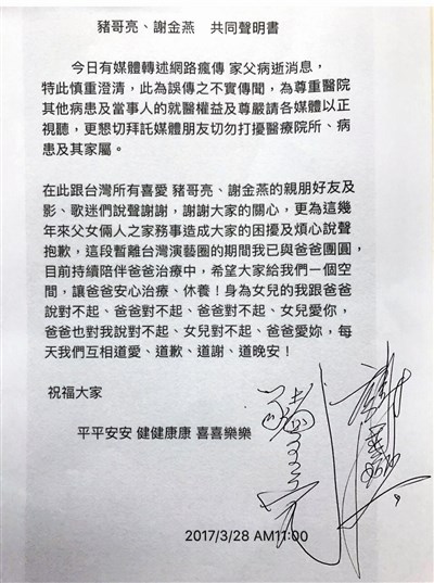 豬哥亮與謝金燕的聯合聲明,附有兩人簽名,父女不再隔空對峙。