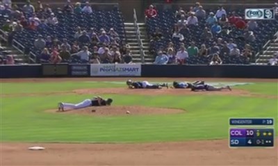 蜜蜂來襲,教士內野的守備球員與裁判全趴下。圖/取自網路