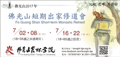 佛光山短期出家修道會 |2017.03.29 語音朗讀 425觀看次 字級 大 中 小 佛光山短期出家修道會 對像:第一梯次18~35歲未婚青年、 第二梯次18~65歲 前一篇文章 台北國際素博展盛大招商 下一篇文章 索取福報 熱門新聞 01南華大學茶禪雅集 靜坐書寫時光膠囊2026.03.2602星雲大師靈骨分燈歐洲 傳燈萬方2026.03.2603佛光山365日越文版 贈西貢日航大酒店2026.03.2704紅綠葡萄抗氧化抗發炎 連皮吃獲取健康全效益2026.03.2705台灣工藝3專書 呈現文化獨特樣貌2026.03.2706中職37年 明大巨蛋開幕戰2026.03.2707兒童節禮物 新北學生自己票選2026.03.2608北京中學老師 精準預言美伊開戰2026.03.2609全球首例 菲國進入能源緊急狀態2026.03.2610滑雪勝地轉型 數位遊牧族進駐2026.03.26 訂閱電子報 台北市 天氣預報 台灣一週天氣預報 相關報導 以文字護持人間福報運動睡眠新科技 養生保健新利器房仲第一品牌 永慶加薪3% 體驗美好手作 製皂幸福時光 博愛社大春季班招生中 薩克斯風吹奏春季班 人間大學台中分校招生中 跨越十年縱橫南半球到北半球 《行者》新書上市