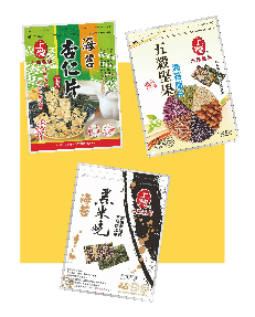 水岸品鮮產品包括脆酥的雙面海苔包,香氣濃郁的白芝麻,搭配飽滿的杏仁片,產生香、酥、脆的優質口感,還有人氣商品五穀堅果脆片等,令人一口接一口,不管是小孩還是大人,皆回味無窮。食材中的黑米為米中珍品,素有貢米、藥米、長壽米之美譽,以黑米製作的海苔黑米燒,採用新鮮食材、烘焙非油炸,不含防腐劑,是下午茶、健康養生最佳休閒食品。