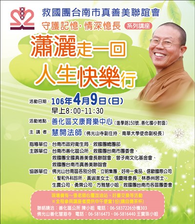 慧開法師講座:瀟灑走一回 人生快樂行 |2017.04.06 語音朗讀 800觀看次 字級 大 中 小 慧開法師講座:瀟灑走一回 人生快樂行 時間:4/9早上8時至11時30分 地點:善化區文康育樂中心 前一篇文章 U2 磁能按摩器 下一篇文章 妙檀香洗衣粉、洗衣精 熱門新聞 01【詩】白花鬼2026.03.2502鑲嵌藝術2026.03.2303故宮特展神獸再現 麒麟、鳳凰登場 2026.03.2404南華大學茶禪雅集 靜坐書寫時光膠囊2026.03.2605楊筑云、林芷均 奧爾良羽賽獲亞軍2026.03.2306星雲大師靈骨分燈北美 法脈永傳2026.03.2407星雲大師靈骨分燈歐洲 傳燈萬方2026.03.2608中南部水庫水位告急 各地農損頻傳2026.03.2409人間佛教聯合總會訪越南 弘法新契機2026.03.2310沉浸式共織宇宙 在新北美術館2026.03.23 訂閱電子報 台北市 天氣預報 台灣一週天氣預報 相關報導 以文字護持人間福報運動睡眠新科技 養生保健新利器房仲第一品牌 永慶加薪3% 體驗美好手作 製皂幸福時光 博愛社大春季班招生中 薩克斯風吹奏春季班 人間大學台中分校招生中 跨越十年縱橫南半球到北半球 《行者》新書上市