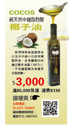 「COCOS」純天然中鏈脂肪酸椰子油 |2017.04.06 語音朗讀 1848觀看次 字級 大 中 小 「COCOS」純天然中鏈脂肪酸椰子油 含有豐富的中鏈三酸甘油酯(MCTs),不含膽固醇及有害反式脂肪酸。 前一篇文章 誠以善香堂 手工線香專業品牌 下一篇文章 佛光山短期出家修道會 熱門新聞 01HBL周末總決賽 8校燃戰火 2026.03.2002返鄉火車擠爆2026.03.2003中南部大旱 高雄3月已73件山林火警 2026.03.2104星雲大師靈骨 12道場迎奉法燈遠傳2026.03.2005珍寶入地宮 法華經奉納佛光大佛2026.03.2106新北市美術館 共織宇宙特展2026.03.2007【美好生活】酸澀 蔓越莓 烤出 幸福甜2026.03.2008人間佛教聯合總會訪越南 弘法新契機2026.03.2309研讀星雲大師人間佛教傳燈錄 永續傳承智慧2026.03.2110「基隆三炷香」將拆 獲提報歷史建築2026.03.20 訂閱電子報 台北市 天氣預報 台灣一週天氣預報 相關報導 以文字護持人間福報運動睡眠新科技 養生保健新利器房仲第一品牌 永慶加薪3% 體驗美好手作 製皂幸福時光 博愛社大春季班招生中 薩克斯風吹奏春季班 人間大學台中分校招生中 跨越十年縱橫南半球到北半球 《行者》新書上市