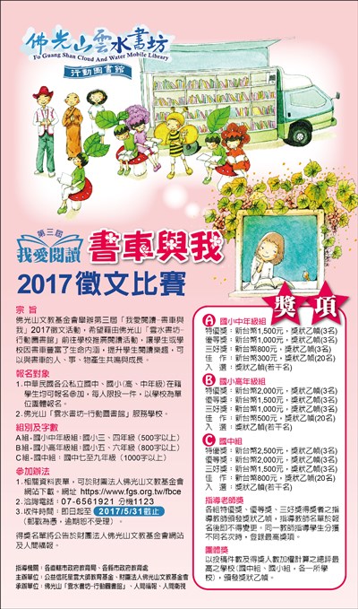 第三屆我愛閱讀徵文比賽 |2017.04.13 語音朗讀 535觀看次 字級 大 中 小 第三屆我愛閱讀徵文比賽 報名對象:公私立國中小在籍學生 相關資料表單,可於財團法人佛光山文教基金會網站下載。 前一篇文章 2017佛光文化國際書展暨蔬食博覽會宣導 下一篇文章 香海文化《和大師一起吃飯》 熱門新聞 01水晶物理性 與化學性質2026.03.1702店貓上班摸魚睡翻 萌樣逗樂網友2026.03.1803大馬急轉彎 撤回美對等貿易協議無效說 2026.03.1804【歷史點滴】走過百年 高雄橋頭糖廠2026.03.1805北美最乾燥加州死谷 罕見繁花錦簇2026.03.1806【大江南北】哈爾濱呼蘭天主教堂2026.03.1807【分享時刻】某些愛2026.03.1808草間彌生作品 德國展出2026.03.1809WBC委內瑞拉首闖決賽 今與美爭冠2026.03.1810美海軍引進機器人 爬牆維修艦艇2026.03.19 訂閱電子報 台北市 天氣預報 台灣一週天氣預報 相關報導 以文字護持人間福報運動睡眠新科技 養生保健新利器房仲第一品牌 永慶加薪3% 體驗美好手作 製皂幸福時光 博愛社大春季班招生中 薩克斯風吹奏春季班 人間大學台中分校招生中 跨越十年縱橫南半球到北半球 《行者》新書上市