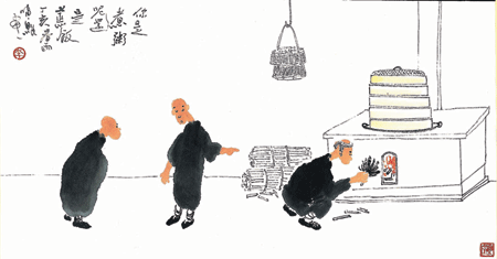 道楷:「工人們淗米生火,寺裡的修行人煮粥蒸飯。」