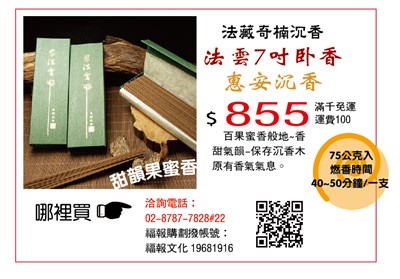 【法藏奇楠沉香】滿千免運 |2017.04.20 語音朗讀 514觀看次 字級 大 中 小 【法藏奇楠沉香】滿千免運 百果蜜香般地~香甜氣韻-保存沉香木原有香氣氣息。 一支 75公克/燃香時間為:40~50分鐘。 前一篇文章 佛光文化《佛光恆常-安徽佛教藝術特展》選集 下一篇文章 毒品的新衣 熱門新聞 01【院線片】《陽光女子合唱團》淚水與歌聲創造票房紀錄2026.03.1402飛天白馬秀 燈會大亮點2026.03.1503菲律賓萬年寺 民眾自發迎請 展現弘法成果2026.03.1904美軍轟 伊朗石油命脈哈格島 2026.03.1505澳洲南天寺 南半球續法燈 人間佛教落地生根2026.03.1906越南大選 料共產黨壓倒性掌控2026.03.1607美海軍引進機器人 爬牆維修艦艇2026.03.1908經典賽擊退美國 委內瑞拉首奪冠2026.03.1909倒楣鼓身河豚 被調皮海豚當球玩2026.03.1910馬來西亞東禪寺 弘法育才 擘畫東南亞發展願景2026.03.19 訂閱電子報 台北市 天氣預報 台灣一週天氣預報 相關報導 以文字護持人間福報運動睡眠新科技 養生保健新利器房仲第一品牌 永慶加薪3% 體驗美好手作 製皂幸福時光 博愛社大春季班招生中 薩克斯風吹奏春季班 人間大學台中分校招生中 跨越十年縱橫南半球到北半球 《行者》新書上市