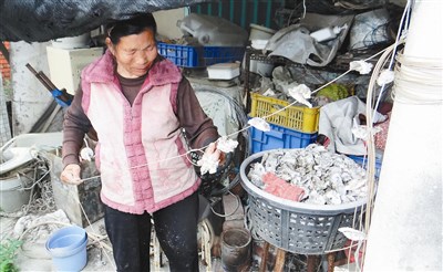 林金貴七十五老母,獨守台西老屋,靠著串蚵殼維生。圖/蔡維斌