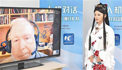 中國智能機器人佳佳(右)扮演記者,與美國著名的科技觀察家凱利(左)進行人機對話。圖/新華社