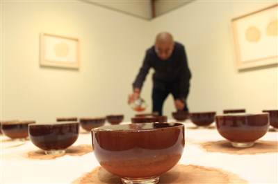 這次在館內布置四組上茶裝置,每組分別鋪上6層宣紙,並等距離排列一定數量的透明玻璃碗,藝術家每天固定時間親自將茶湯注入玻璃碗中至滿溢,並於宣紙上留下層層茶漬成為紙本作品。