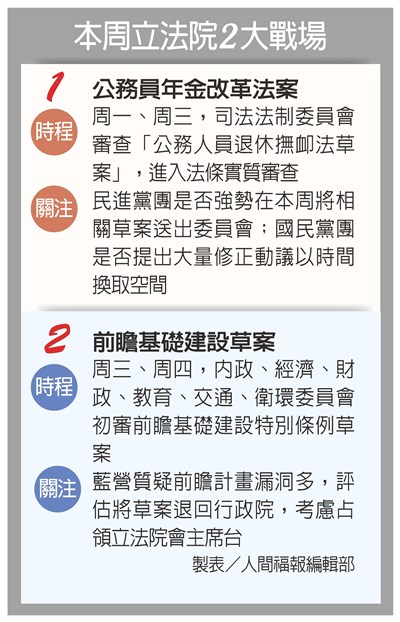【記者陳忠賢台北報導】立法院本周進入「深水區」,包括公、教人員退休年金改革草案及前瞻基礎建設條例草案,開始審查。昨天率先登場「公務人員退休撫卹法草案」,國民黨團祭出「柔性」杯葛,以勞動節及母親節將至,要求暫不審查,但表決後不通過;到了下午又以法務部未派員列席,要求停審,藍綠雙方爆發推擠。雖然隨後繼續開會,但由於委員爭相發言,審查速度緩慢,會議昨挑燈夜戰至午夜。