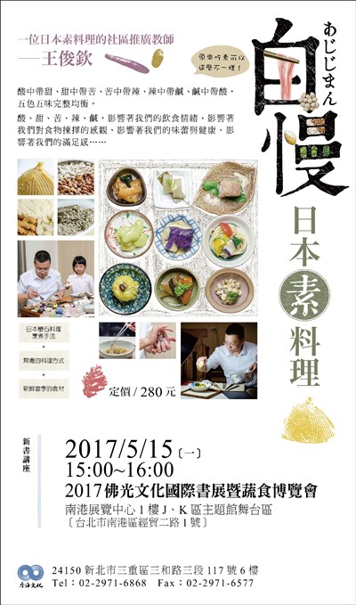 《白慢日本素料理》新書講座 |2017.05.06 語音朗讀 588觀看次 字級 大 中 小 香海文化於5/15南港書蔬展舉辦《白慢日本素料理》新書講座。 時間:15:00~16:00 地點:一樓J、K區主題館舞台區 前一篇文章 環保餐具組 (2碗+1筷+1袋) 下一篇文章 警政署宣導防假檢警詐騙 熱門新聞 01【詩】草螟公2025.12.1802【閃文集】火星暗斑之謎2025.12.1603福建艦航經台海 空拍照首曝光2025.12.1804高雄新航線明啟動 佛光山成亮點2025.12.1705如何優雅不濺水花?2025.12.1606寶塔寺 三代同堂搓湯圓、繪燈籠2025.12.1607受星雲大師啟發 旅日名廚獲頒黃綬褒章2025.12.1608社論--改變與改變的能力2025.12.1609資助流浪漢之家 里斯本佛光人跨文化送暖2025.12.1810多倫多佛光山龍獅團 中華文化薪火相傳2025.12.18 訂閱電子報 台北市 天氣預報 台灣一週天氣預報 相關報導 以文字護持人間福報運動睡眠新科技 養生保健新利器房仲第一品牌 永慶加薪3% 體驗美好手作 製皂幸福時光 博愛社大春季班招生中 薩克斯風吹奏春季班 人間大學台中分校招生中 跨越十年縱橫南半球到北半球 《行者》新書上市