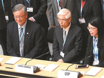 今年的世界衛生大會(WHA)(小圖)五月二十二日在日內瓦舉行。台灣還沒收到邀請函。圖為二○一六年時衛福部長林奏延,順利進入大會場坐上預定席。