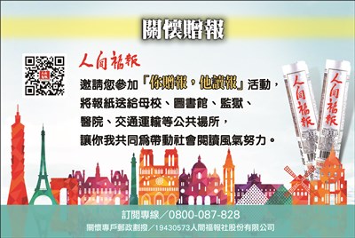 關懷贈報 大家一起來 |2017.05.08 語音朗讀 633觀看次 字級 大 中 小 關懷贈報,邀您參加「你贈報,他讀報」活動。 將《人間福報》送給母校、圖書館、監獄、醫院、交通運輸等公共場所。 前一篇文章 行政秘書學苑招生 下一篇文章 佛光文化書蔬展 歡迎蒞臨 熱門新聞 01【閃文集】火星暗斑之謎2025.12.1602【詩】草螟公2025.12.1803【為人父母】 允許如其所是2025.12.1504【詩】 航夢2025.12.1505東方微笑跨越千年 麥積山石窟現佛館2025.12.1506寶塔寺 三代同堂搓湯圓、繪燈籠2025.12.1607佛光山福國寺 獲頒台南市宗教績優團體獎2025.12.1508高雄新航線明啟動 佛光山成亮點2025.12.1709如何優雅不濺水花?2025.12.1610人間佛教在菲律賓2025.12.14 訂閱電子報 台北市 天氣預報 台灣一週天氣預報 相關報導 以文字護持人間福報運動睡眠新科技 養生保健新利器房仲第一品牌 永慶加薪3% 體驗美好手作 製皂幸福時光 博愛社大春季班招生中 薩克斯風吹奏春季班 人間大學台中分校招生中 跨越十年縱橫南半球到北半球 《行者》新書上市