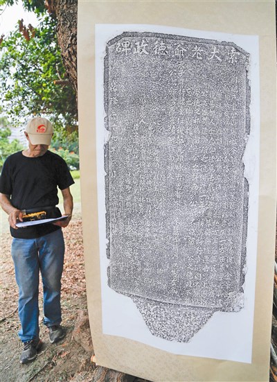 文化局昨天展示「索大老爺德政碑」拓印。圖/中央社