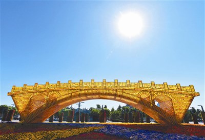 「一帶一路」國際合作高峰論壇14日起在北京召開。圖為北京國家會議中心前的「絲路金橋」景觀作品。圖/新華社