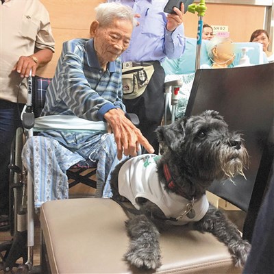 九十七歲的易姓老翁看到狗醫師「強尼」來訪,忍不住伸手摸摸牠。