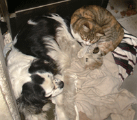 前陣子寒流來襲,家人都提早就寢。某天夜裡,我起身去廚房倒水喝,途經客廳,順便瞄了櫥櫃一眼,咦!居然不見貓咪的身影,再瞧瞧斑斑霸占的沙發,唉唷!怎麼這隻狗變得這麼肥啊!再仔細端詳,嚇!哪裡是斑斑發福了,根本是貓咪跟斑斑倆蜷縮睡在一起。