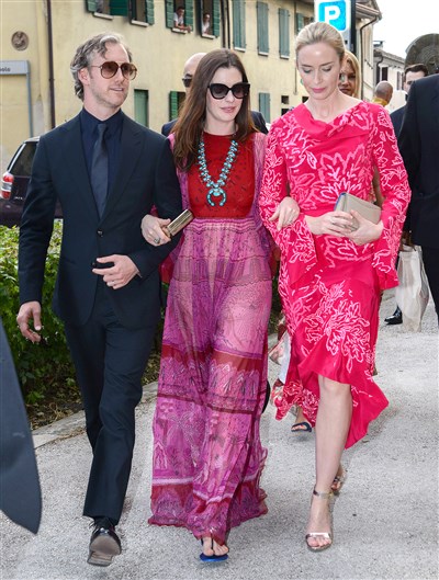 安海瑟薇一襲桃紅色刺繡洋裝配平底涼鞋,和老公一同現身婚宴會場,艾蜜莉布朗身穿同色系洋裝隻身前來,安海瑟薇貼心地挽著她的手一起進場,2人的好交情表露無疑。