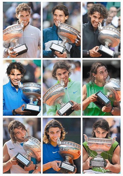 納達爾在法國網球公開賽拿下第十個冠軍杯,圖為他2014(左上至右下)、2013、2012、2011、2010、2008、2007、2006、2005年9度在法網奪冠的檔案照。圖╱法新社、路透