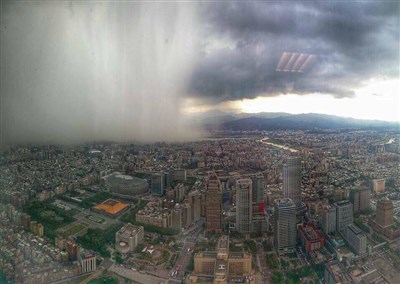 【本報台北訊】有網友在網路貼文,表示在101大樓裡看到風雨欲來,只見左邊有厚重烏雲,加上看起來不小的雨勢,但右邊完全沒有下雨,貼文表示「台灣要亡了」,讓許多網友驚呼是難得的景象。
