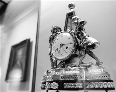 法國高中會考15日展開,題目包括「藝術作品一定要美嗎?」等;圖為以法國思想家伏爾泰、盧梭爭辯場景為裝飾的時鐘。圖/新華社