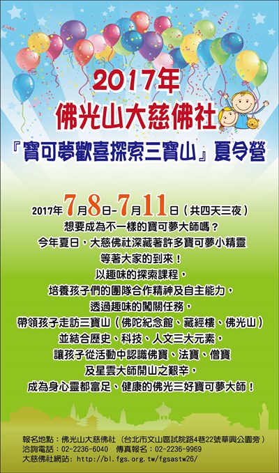 大慈佛社兒童夏令營 7/8開營 |2017.06.16 語音朗讀 1126觀看次 字級 大 中 小 大慈佛社兒童夏令營「寶可夢歡喜探索三寶山」7/8開營,為期4天三夜,歡迎報名。 報名地點:佛光山大慈佛社 洽詢電話:02-2236-6040 前一篇文章 佛光山短期出家修道會 下一篇文章 犯罪預防 吉祥物暨LOGO徵件 熱門新聞 01多元計程車機場載客 高雄先試辦2026.03.1102台灣燈會 法國「飛天白馬秀」演到14日2026.03.1103記星雲大師二三事2026.03.1004中東戰火 國際油價飆破 100 美元2026.03.1005【閱讀生活】明天會更好2026.03.1006佛光山花蓮光復佛光緣 灑淨啟用2026.03.1007千名愛書人 共讀中國佛教文學史2026.03.1008【小書法家】攏馬歡喜2026.03.1009多晒太陽多活動 長輩不失眠2026.03.1010星雲大師全集【傳記】 百年佛緣─社緣篇 讓體育在佛教生根 3 - 12026.03.10 訂閱電子報 台北市 天氣預報 台灣一週天氣預報 相關報導 以文字護持人間福報運動睡眠新科技 養生保健新利器房仲第一品牌 永慶加薪3% 體驗美好手作 製皂幸福時光 博愛社大春季班招生中 薩克斯風吹奏春季班 人間大學台中分校招生中 跨越十年縱橫南半球到北半球 《行者》新書上市