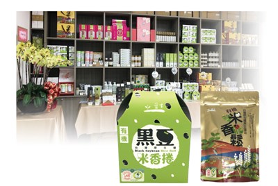 上圖為護生善緣營運總部商品區,下圖為黑豆茶、米香捲。