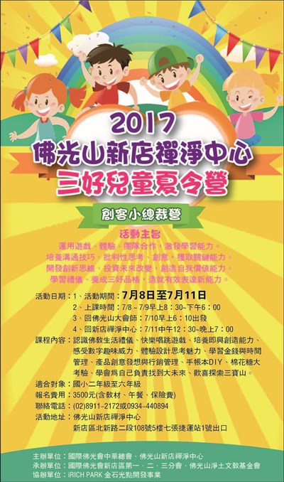 新店禪淨中心 三好兒童夏令營 |2017.06.20 語音朗讀 3977觀看次 字級 大 中 小 新店禪淨中心三好兒童夏令營,7月8日至11日舉辦。 活動時間:7月8日至11日,對象:國小二年級至六年級 前一篇文章 三葉健康概念養生鍋 吃出健康 下一篇文章 桃園歡樂夢想國 慶開幕 熱門新聞 01多元計程車機場載客 高雄先試辦2026.03.1102台灣燈會 法國「飛天白馬秀」演到14日2026.03.1103【院線片】《陽光女子合唱團》淚水與歌聲創造票房紀錄2026.03.1404【分享時刻】梨木小提燈2026.03.1305南投三好校園 交流深化品格教育成果2026.03.1106法寶贈南天大學 學術信仰新對話2026.03.1307開齋節 印尼佛光人送物資2026.03.1108紐約「星光在人間」音樂會 憶星雲大師2026.03.1109佛光山蓮華寺新春慶典 獲美國會頒獎2026.03.1310佛教友誼獎學金研習 青年涵養正知正見2026.03.13 訂閱電子報 台北市 天氣預報 台灣一週天氣預報 相關報導 以文字護持人間福報運動睡眠新科技 養生保健新利器房仲第一品牌 永慶加薪3% 體驗美好手作 製皂幸福時光 博愛社大春季班招生中 薩克斯風吹奏春季班 人間大學台中分校招生中 跨越十年縱橫南半球到北半球 《行者》新書上市