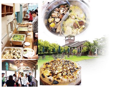 園中規劃有戶外小食區,逛累了可以吃吃蔬食臭豆腐、燒冷怪(冰品)、及人氣招牌食品經典瑪格麗特披薩等,張嘉誠推廣健康蔬食30年多年,園區「百食繪」自助蔬食餐廳,採開放式廚房,提供百道以上健康蔬食,從食材到醬油等,完全天然無添加化學物品,並推出五行養生鍋物Buffet吃到飽,以自種的有機野菜健康蔬食、港式點心、甜點、特色料理等健康蔬食,讓大家在河岸邊享受美食與美景。