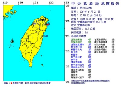 下午3時25分 宜蘭地震 |2017.06.21 語音朗讀 887觀看次 字級 大 中 小 今天下午3時25分,宜蘭近海發生芮氏規模5.0地震。圖/取自網路 【本報台北訊】今天下午3時25分,宜蘭近海發生芮氏規模5.0地震,深度61.5公里。各地最大震度:花蓮3級;新北市、桃竹地區、台中、雲林2級;台北、基隆、苗栗、南投、彰化、嘉義1級。 前一篇文章 夏至消暑 不要冰才好 下一篇文章 夏至衛星照 南半球永夜現蹤 熱門新聞 01佛光山在家戒會 海內外戒子行佛2025.10.2702星雲大師全集【經義】佛法滿人間—心能轉境2025.10.2703紐國馬努考東區警局培訓 北島佛光山召開2025.10.2804【小土豆日記】泡麵來襲2025.10.2705跆拳世錦賽 18歲劉侑芸奪金2025.10.2706台北動物園壁畫 展現野性生命力2025.10.2707【台灣媽媽在荷蘭】網路世界 不能有話就說2025.10.2708巨型卡通登維港2025.10.2709中美談妥 貿易協議框架2025.10.2710星光水岸樂園 親子暢快消暑2025.10.27 訂閱電子報 台北市 天氣預報 台灣一週天氣預報 相關報導 【星雲大師如是說】處事禪心【星雲大師如是說】人間佛教【星雲大師如是說】正信之美【星雲大師如是說】輪轉相繼【星雲大師如是說】有情的層次【星雲大師如是說】六忍歌