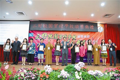 【記者羅智華嘉義報導】「第六屆三好校園實踐學校頒獎典禮暨品德教育成果分享會」昨天在南華大學盛大登場,共有上百所學校與三百位校長、老師齊聚一堂見證三好成果。今年共有一百四十七所學校獲獎;當中,還有來自中國大陸東莞台商子弟學校、東莞理工學院粵台產業科技學院等校跨海支持。