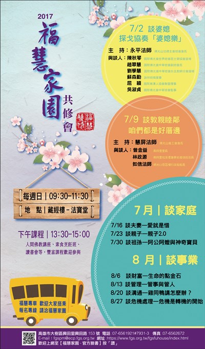 福慧家園共修會 場場精采 |2017.06.26 語音朗讀 590觀看次 字級 大 中 小 福慧家園共修會7月談家庭、8月談事業,場場精采。 7/2談婆媳─探戈協奏「婆媳樂」,7/9談敦親睦鄰─咱們都是好厝邊。 時間:每周日10時至15時 地點:佛光山藏經樓-法寶堂 人間佛教講座、修持課程、素食烹飪班等,豐富課程歡迎參與。 前一篇文章 心的旅程 生活美學‧身心假期 下一篇文章 口感甘醇純厚 三泰有機茶好喝 熱門新聞 01【院線片】《陽光女子合唱團》淚水與歌聲創造票房紀錄2026.03.1402飛天白馬秀 燈會大亮點2026.03.1503菲律賓萬年寺 民眾自發迎請 展現弘法成果2026.03.1904美軍轟 伊朗石油命脈哈格島 2026.03.1505澳洲南天寺 南半球續法燈 人間佛教落地生根2026.03.1906越南大選 料共產黨壓倒性掌控2026.03.1607美海軍引進機器人 爬牆維修艦艇2026.03.1908經典賽擊退美國 委內瑞拉首奪冠2026.03.1909倒楣鼓身河豚 被調皮海豚當球玩2026.03.1910馬來西亞東禪寺 弘法育才 擘畫東南亞發展願景2026.03.19 訂閱電子報 台北市 天氣預報 台灣一週天氣預報 相關報導 以文字護持人間福報運動睡眠新科技 養生保健新利器房仲第一品牌 永慶加薪3% 體驗美好手作 製皂幸福時光 博愛社大春季班招生中 薩克斯風吹奏春季班 人間大學台中分校招生中 跨越十年縱橫南半球到北半球 《行者》新書上市