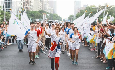 【本報台北訊】二○一七台北世大運聖火自義大利杜林引母火,先後抵達義大利拿坡里、泰國曼谷,韓國大邱傳遞聖火,昨天下午世大運聖火返抵國門後直奔市府,由跆拳道金牌選手陳詩欣拿著火把跑向台北市政府,數百名民眾夾道歡迎。