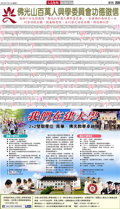 佛光山百萬人興學徵信 每月1日刊登