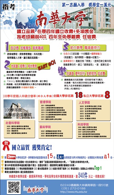 南華大學招生 國立收費+多項獎金 |2017.07.02 語音朗讀 783觀看次 字級 大 中 小 南華大學招生,國立收費+多項獎金。 招生學系:社會科學、管理學、藝術學、人文學、科技學 前一篇文章 國際青年生命禪學營7/23開營 下一篇文章 行政秘書學苑招生 歡迎報名 熱門新聞 01水晶物理性 與化學性質2026.03.1702北美最乾燥加州死谷 罕見繁花錦簇2026.03.1803大馬急轉彎 撤回美對等貿易協議無效說 2026.03.1804店貓上班摸魚睡翻 萌樣逗樂網友2026.03.1805【歷史點滴】走過百年 高雄橋頭糖廠2026.03.1806美海軍引進機器人 爬牆維修艦艇2026.03.1907【大江南北】哈爾濱呼蘭天主教堂2026.03.1808【分享時刻】某些愛2026.03.1809澎湖食農教育 向下扎根2026.03.1910草間彌生作品 德國展出2026.03.18 訂閱電子報 台北市 天氣預報 台灣一週天氣預報 相關報導 以文字護持人間福報運動睡眠新科技 養生保健新利器房仲第一品牌 永慶加薪3% 體驗美好手作 製皂幸福時光 博愛社大春季班招生中 薩克斯風吹奏春季班 人間大學台中分校招生中 跨越十年縱橫南半球到北半球 《行者》新書上市