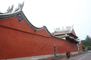 座落在赤崁樓正對面的「祀典武廟」,殿宇以氣勢魏峨見稱,而朱紅色山牆,更具特色。後殿右側有東向的觀音廳及北向的「西社」各一座。觀音廳後為六和堂及延平詩社。西社供奉文昌帝君,為府城士子以文會友之所。