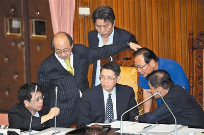 立法院臨時會昨處理《前瞻基礎建設特別條例》草案,立法院長蘇嘉全(前右)邀集民進黨團總召柯建銘(左二)、國民黨團總召林德福(後右)、親民黨團總召李鴻鈞(後中)進行短暫協商。圖/胡經周