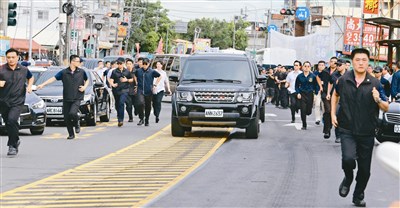 總統蔡英文昨天南下高雄燕巢天后宮參拜,反年改團體如影隨形抗爭,由於抗議人群眾多,國安局人員跑步保護總統車隊離開。圖/劉學聖